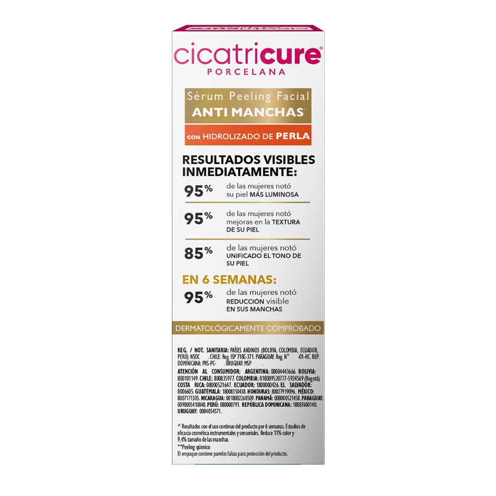 Cicatricure Serum PEELING facial ANTIMANCHAS con HIDROLIZADO de PERLA. Resultados visibles inmediatamente: 95% de las mujeres notó su piel MAS LUMINOSA, y mejoras en la TEXTURA DE LA PIEL. 85% de las mujeres notó UNIFICADO EL TONO DE SU PIEL. En 6 semanas 95% de las mujeres notó REDUCCIÓN visible EN SUS MANCHAS. Dermatologicamente comprobado. Ideal para aplicar en rostro y cuello.