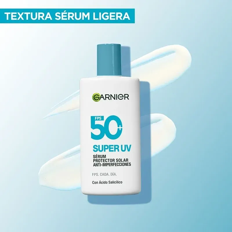 Descubrí el Protector Solar Super UV Anti-Imperfecciones de Garnier para proteger tu piel cada día. Combina FPS50+ y Ácido Salicílico para evitar los daños solares y reducir -66% de imperfecciones. Su fórmula regula la oleosidad por 12 horas y disminuye el brillo sin dejar sensación grasosa.