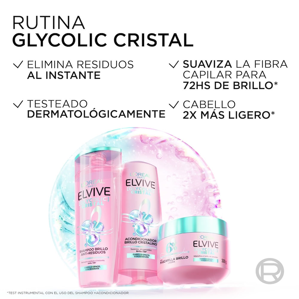 ¿Pelo opaco, pesado por residuos? Factores externos como la contaminación en el aire y en el agua, los tratamientos pesados y el uso recurrente de productos como uso recurrente de gel o la crema para peinar, recubren la fibra capilar de residuos dejando el pelo pesado e impidiendo la reflexión de la luz. Descubrí el shampoo Elvive Glycolic Crystal con [Glicina Anti-Residuos + Ácido Glicólico]. Esta potente solución capilar remueve instantáneamente las acumulaciones, dejando tu pelo 2x más ligero, con un brillo cristalino que dura hasta 72 horas* *Test instrumental, con el uso del shampoo + acondicionador