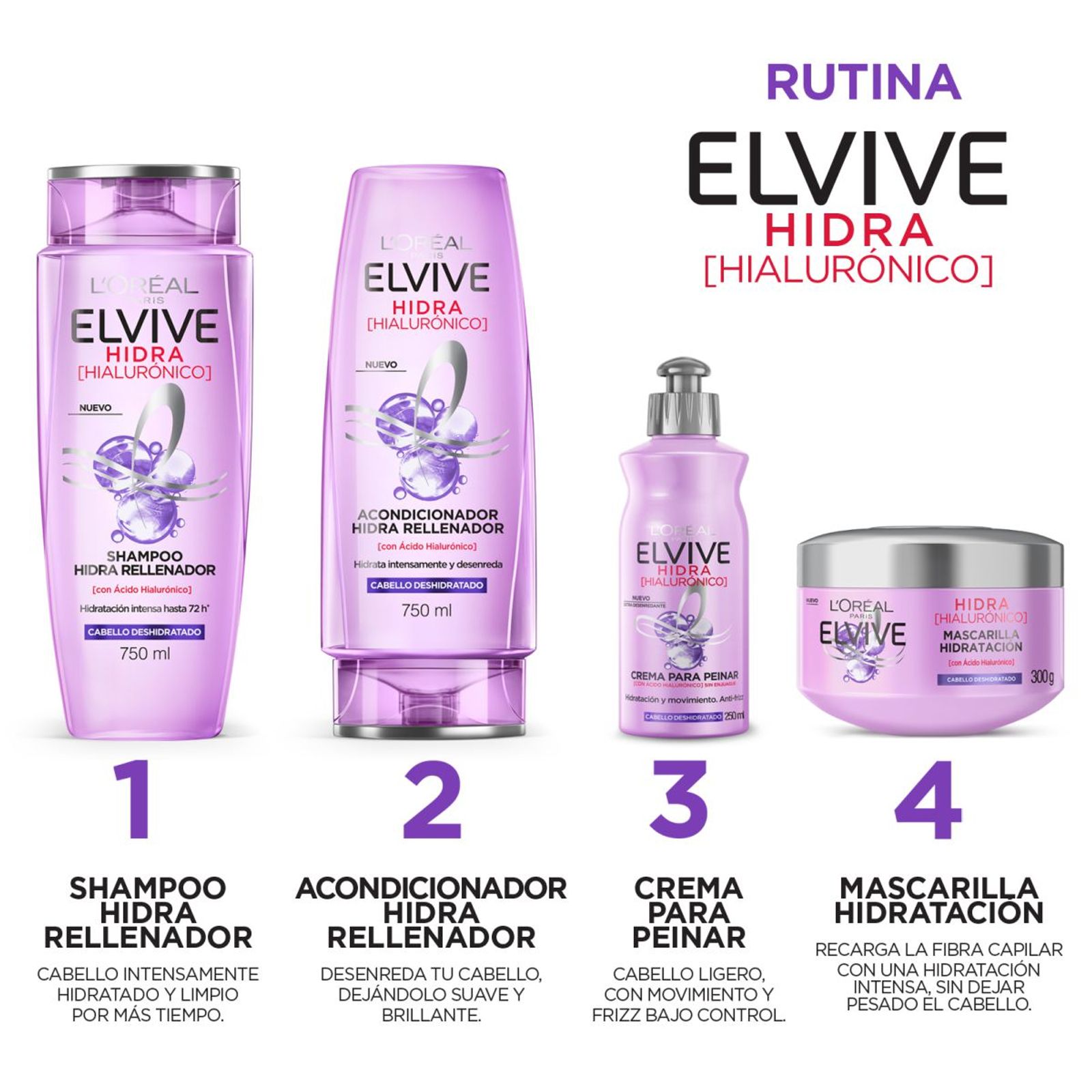 Empezá tu rutina con el Shampoo Hidra Rellenador Elvive Hidra Hialurónico. Su fórmula con Ácido Hialurónico y efecto Anti-Sal, recarga la fibra para una transformación instantánea. Hidratación intensa hasta por 72 hrs.