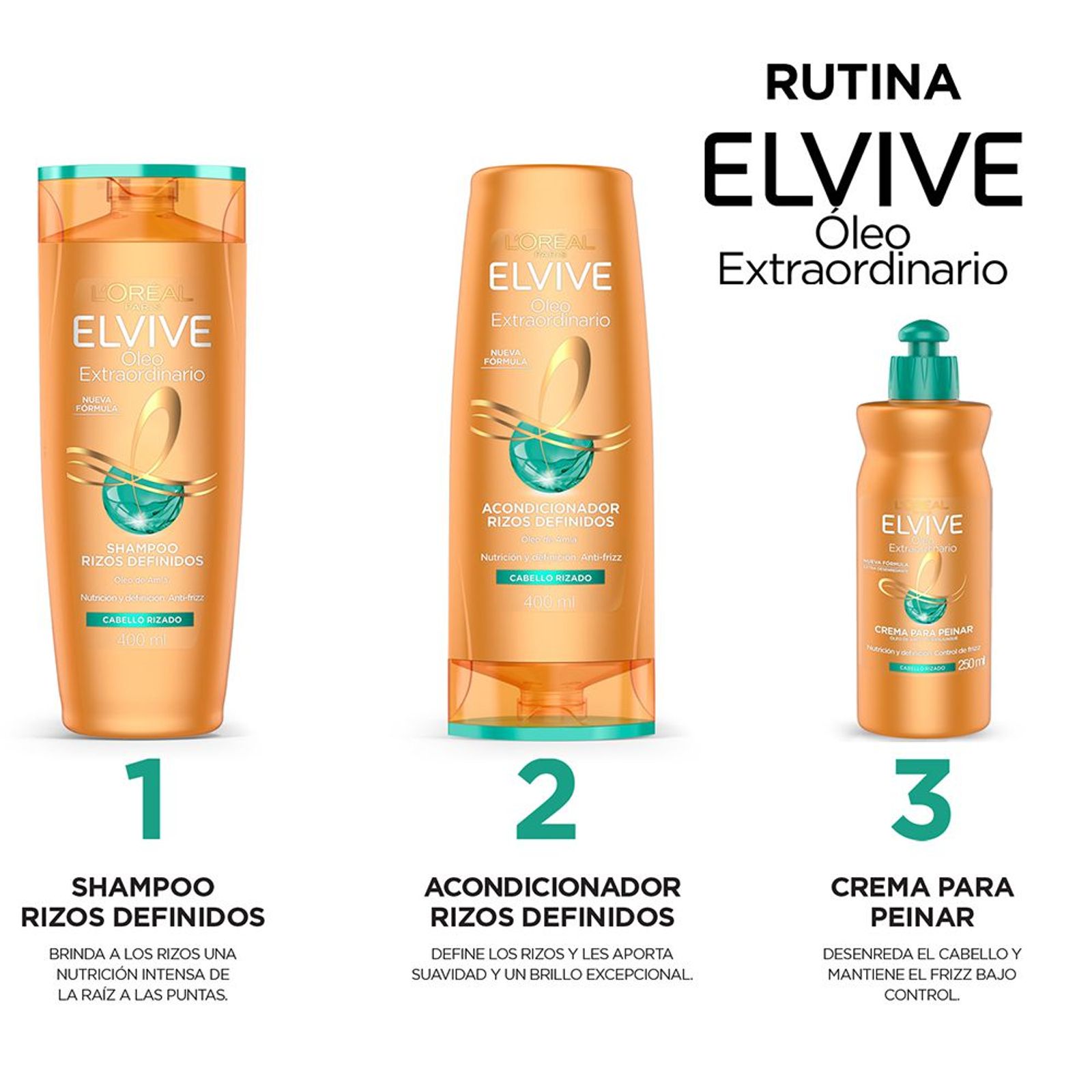 Shampoo para nutrición intensa con un aroma irresistible enriquecido con Aceite de Amla + 6 Oleos de Flores Preciosas. Una textura enriquecida que envuelve cada rizo en una nutrición experta de raíz a punta.. Elvive Óleo Extraordinario Rizos Definidos para cabello con ondas o rizostiene como beneficio: 1. Rizos definidos, suaves y brillantes. 2. Resultados desde el primer uso . Aplicar en puntas y largos sobre cabello mojado después del shampoo Elvive Oleo Extraordinario Rizos Definidos, dejar actuar y enjuagar. El secreto para unos rizos más definidos, utilizar los otros productos de ELVIVE OLEO EXTRAORDINARIO RIZOS DEFINIDOS.
