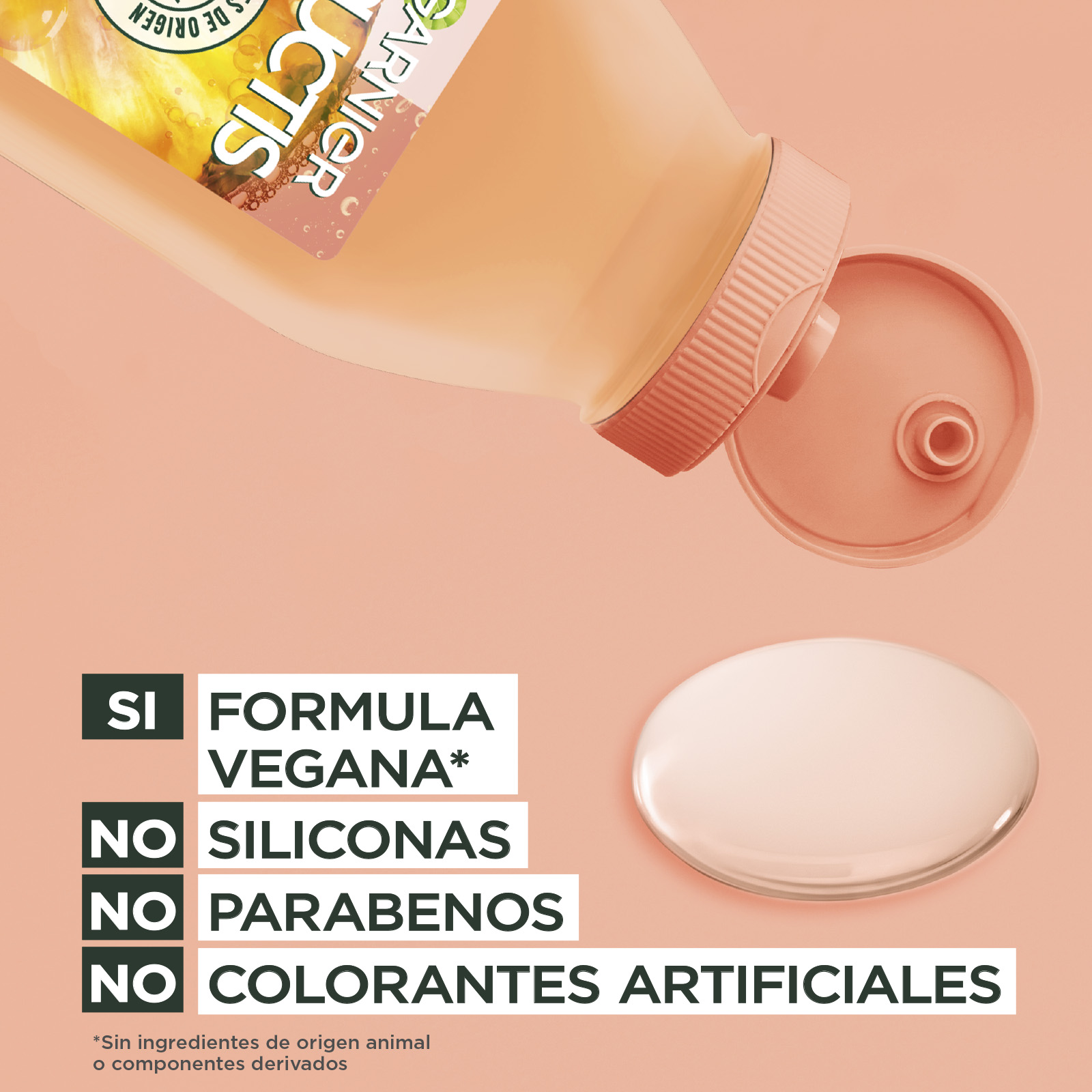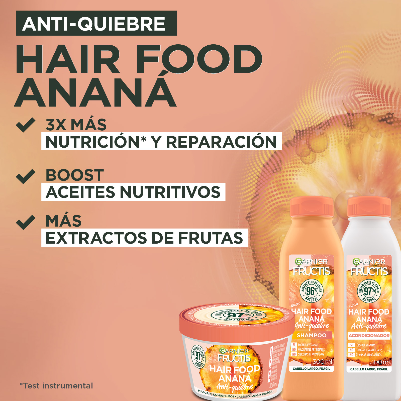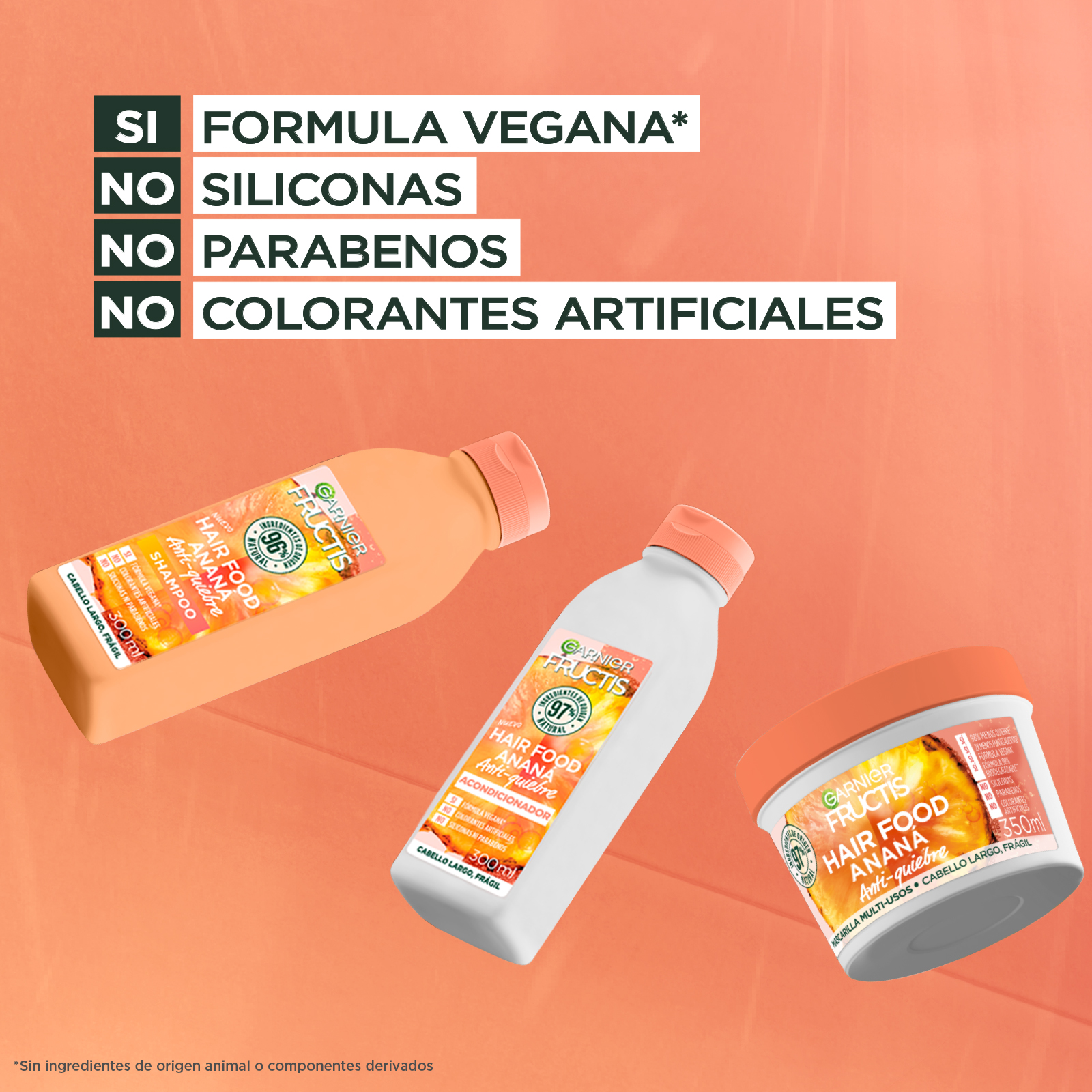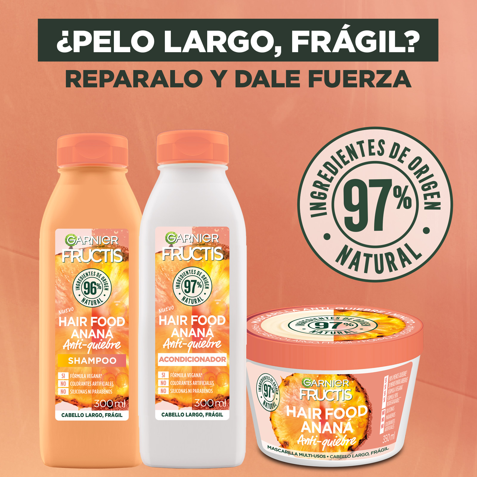 Shampoo Garnier Fructis Hair Food Ananá para pelo largo y frágil. Fórmula nutritiva con extracto de ananá que limpia y restaura el pelo, ingredientes 96% de origen natural. Fórmula vegana. Sin parabenos ni siliconas.