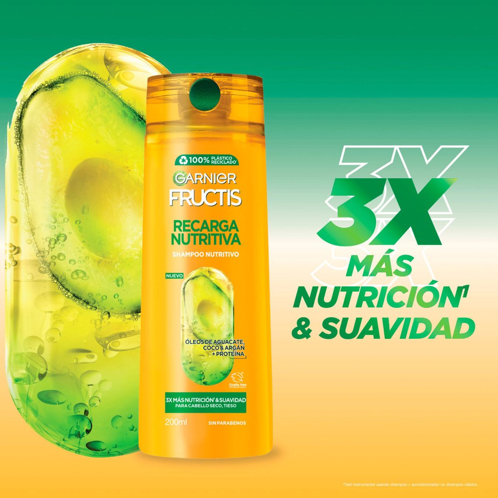 Shampoo para pelo seco, enriquecido con óleos de palta, coco, argán y proteína. Diseñado para proporcionar una triple recarga de nutrición, suavidad y brillo.