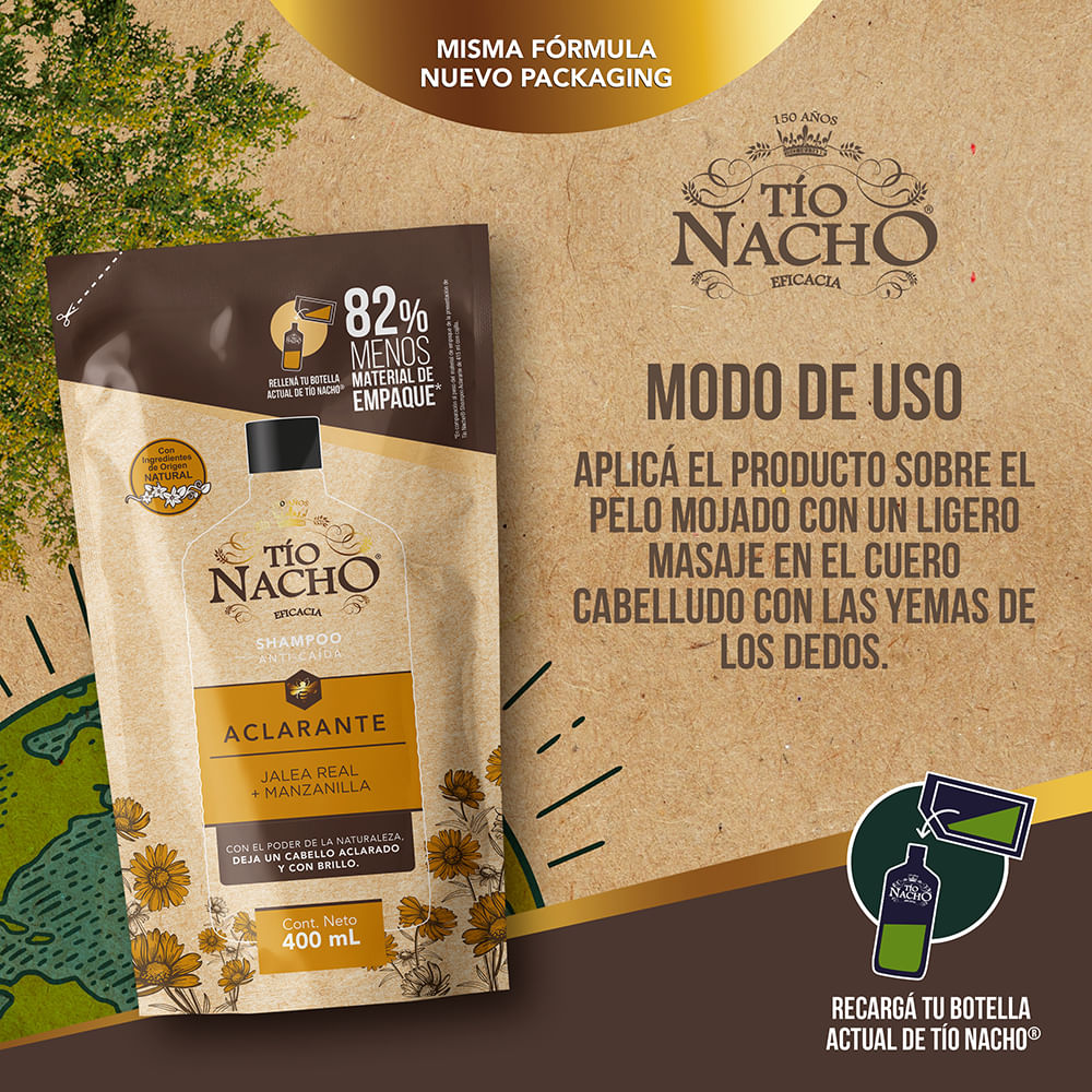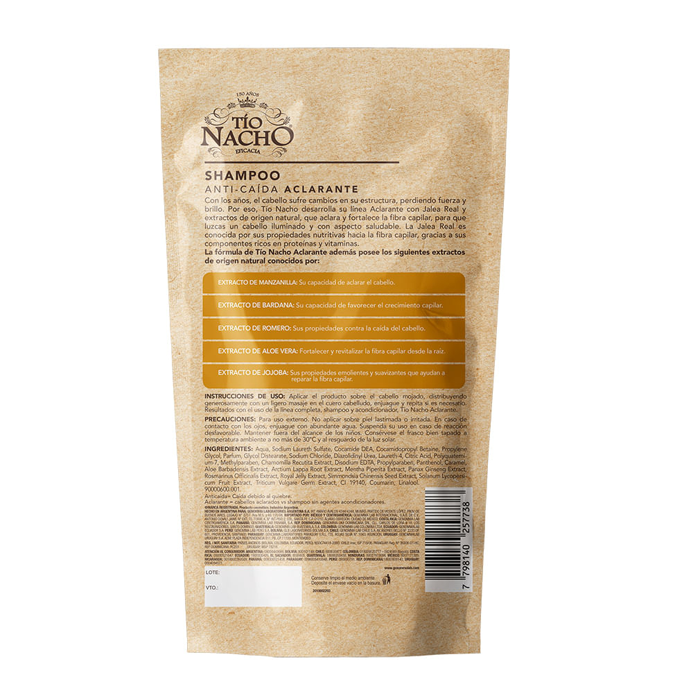 Shampoo Tío Nacho Aclarante, con jalea real, manzanilla y extractos de origen natural.