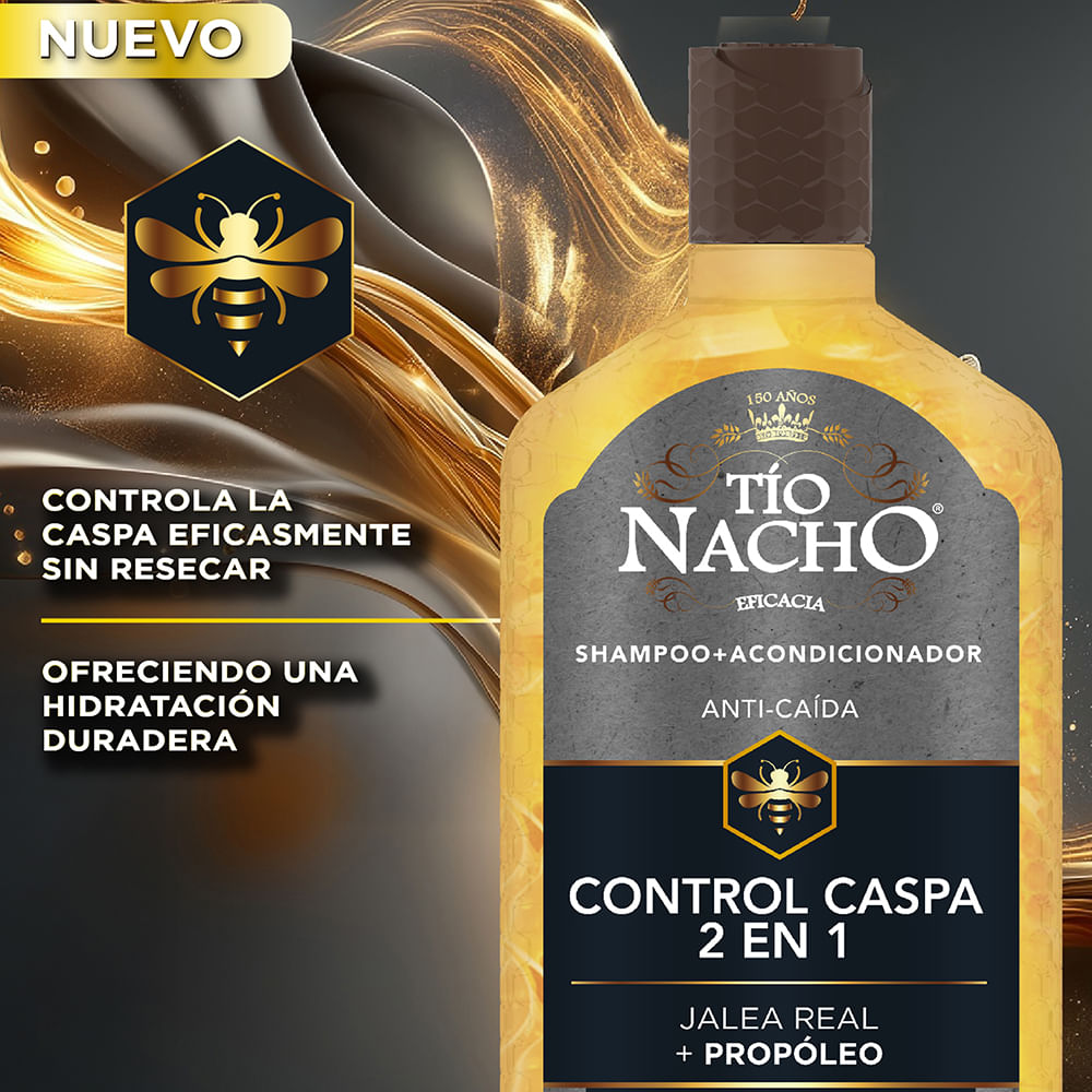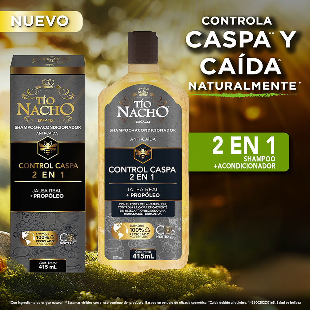 Tío Nacho CONTROL CASPA 2 en 1 brinda un efecto ANTI-CASPA, ayudando a combatir la caspa del cuero cabelludo y disminuyendo la sensación de picazón. Además, gracias a su fórmula 2 en 1 con acondicionador, deja el cabello más suave, fuerte, manejable y con mayor brillo.