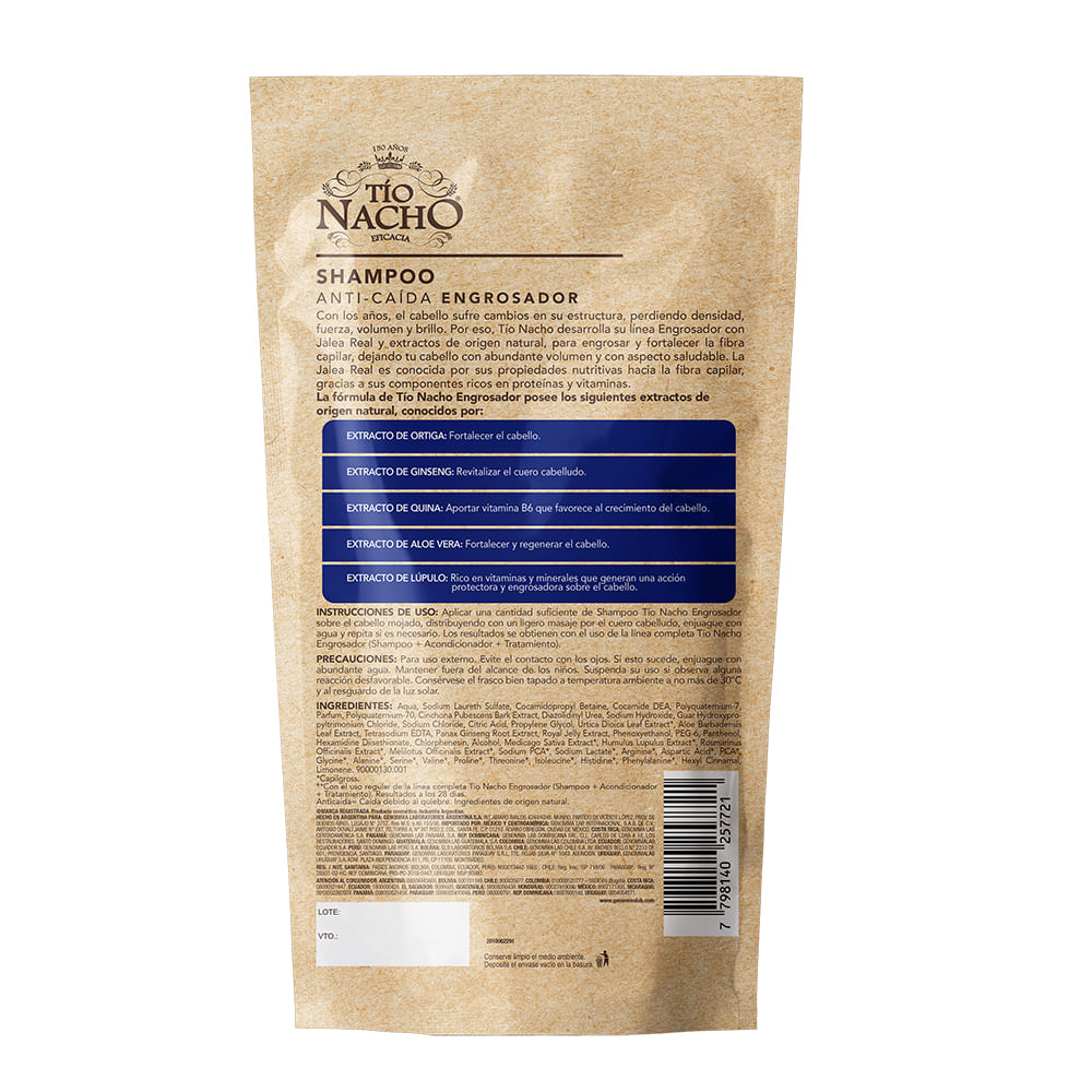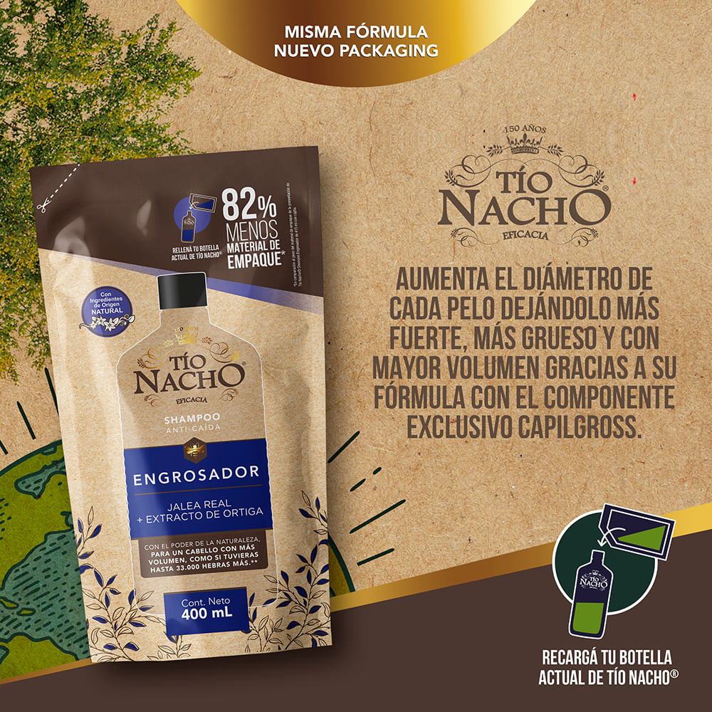 Shampoo Tío Nacho Engrosador Recargable, con una combinación de Jalea Real y Capilgross para pelo con más volumen, fuerte y grueso.