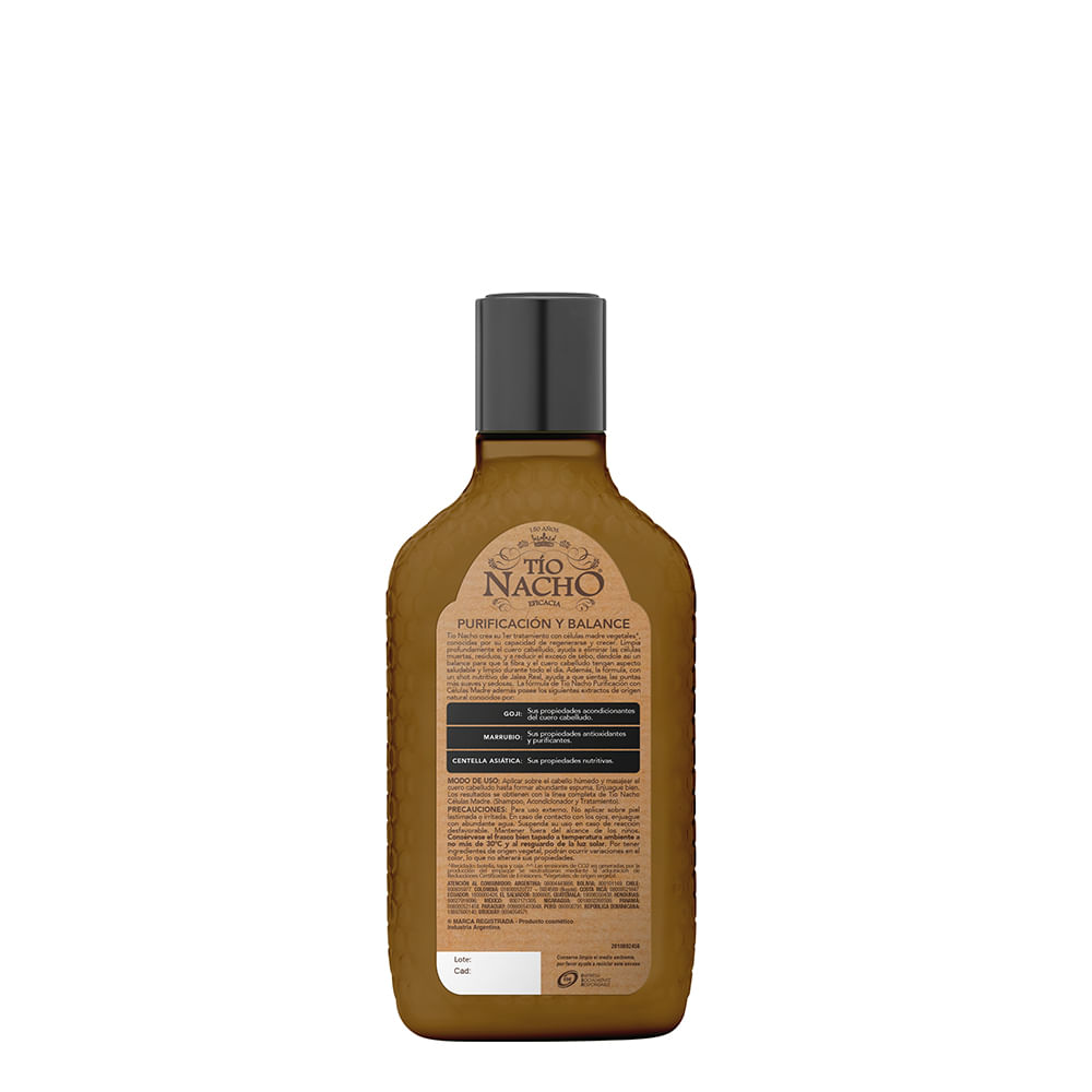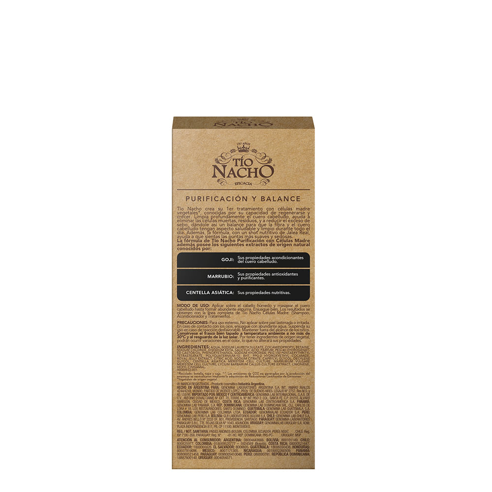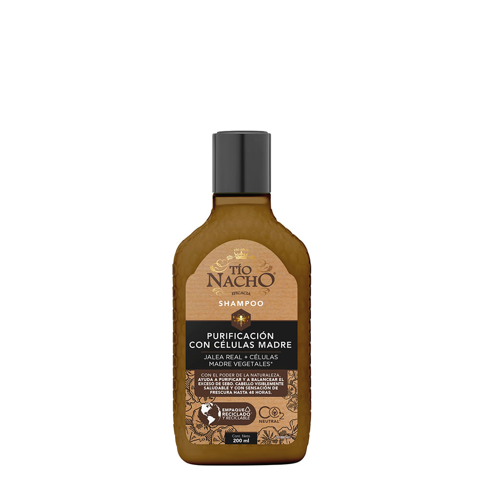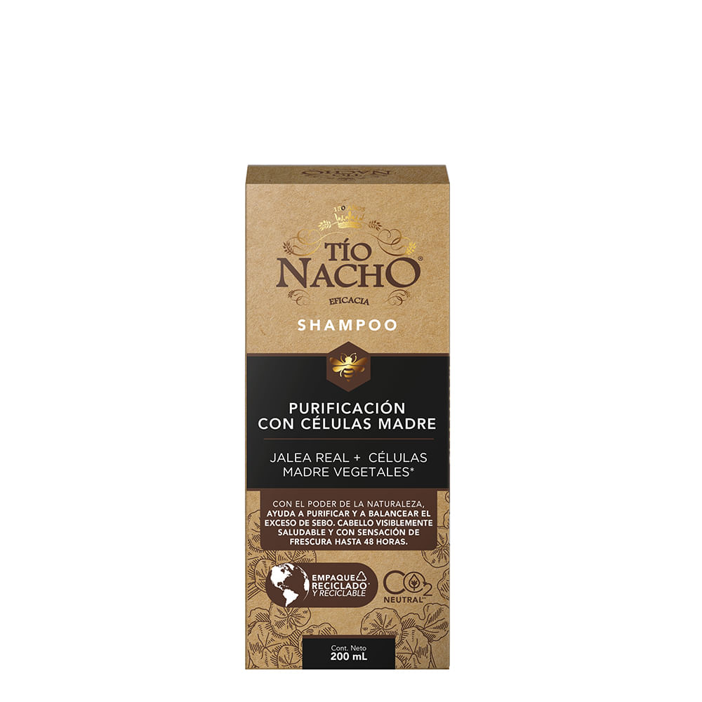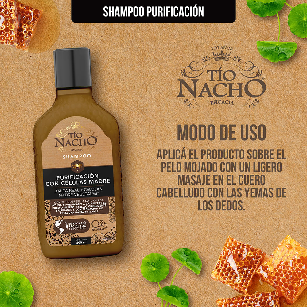- PURIFICACIÓN: Con todo el poder de las células madres vegetales, purifica tu pelo dejándolo limpio hasta por 48 hs - INNOVACIÓN: La primera línea con células madre vegetales. - REALMENTE NATURAL: Tío Nacho Shampoo Purificación contiene es libre de colorantes, parabenos y siliconas. - PARA PELO MIXTO: Tío Nacho Purificación, para pelo normal a mixto, con raíces grasas y puntas secas, aporta limpieza al cuero cabelludo y nutrición en las puntas.