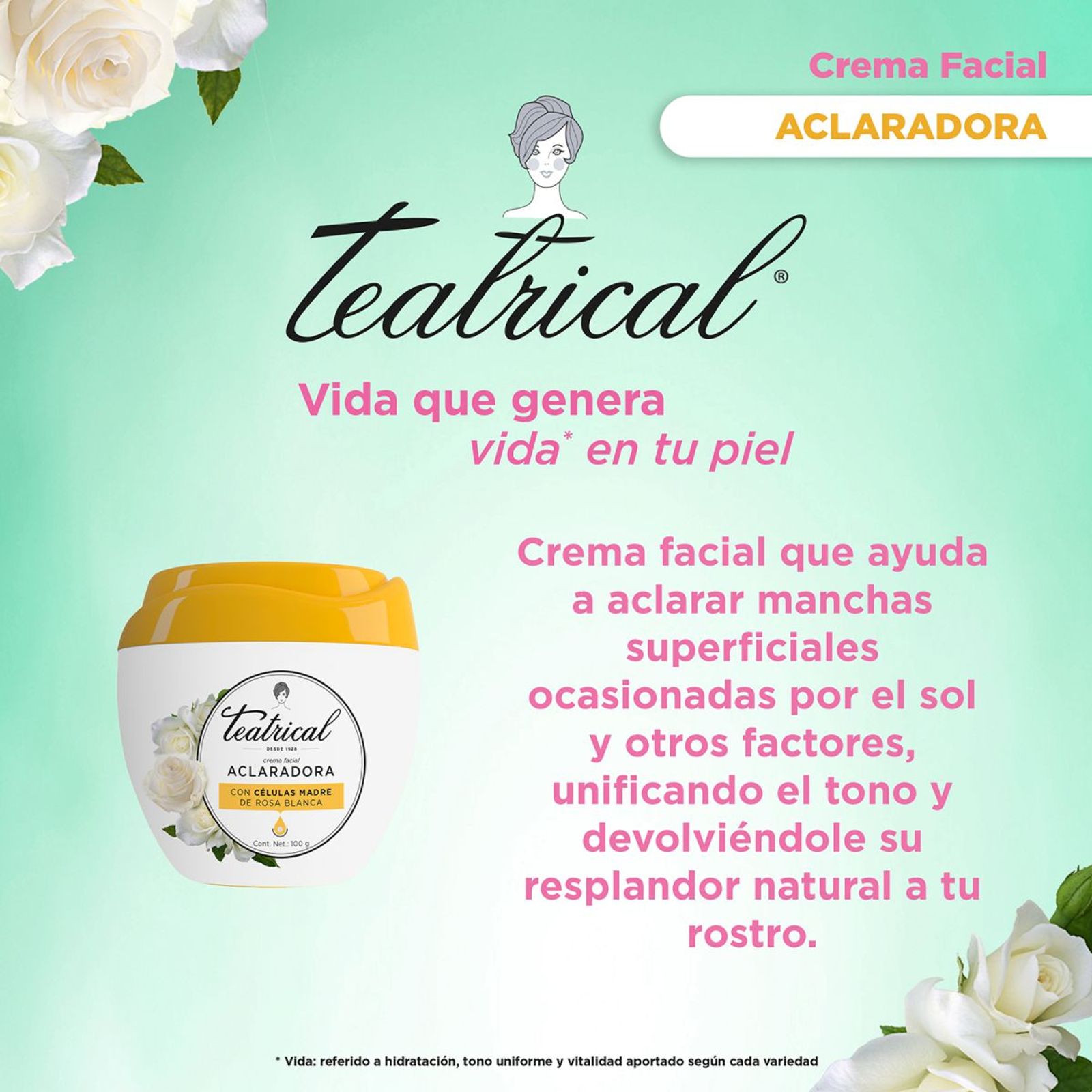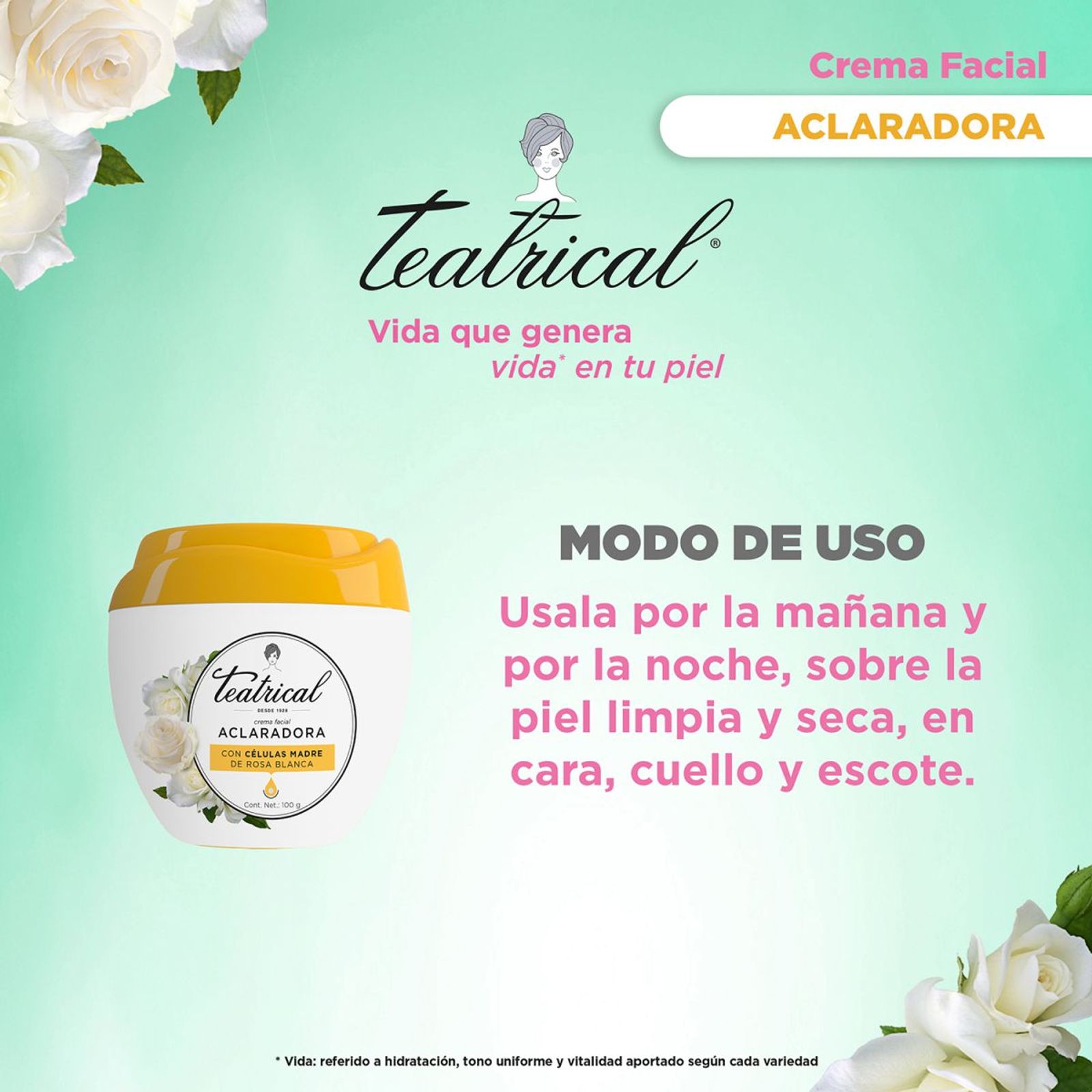 Teatrical crema facial Aclaradora con celulas madre de rosa blanca que reavivan la tez, haciéndola más brillante y más uniforme. Reduciendo defectos de pigmentación. [ ACLARA LAS MANCHAS] Tono más uniforme, piel más hidratada y resultados inmediatos. [ CON FILTRO UV ] Protege tu piel del daño mientras la hidrata a profundidad hasta por 24 horas. [ CON CÉLULAS MADRE ] Única con células madre de rosa blanca. [ CREMA DE APLICACIÓN INTELIGENTE ] Úsala por la mañana y por la noche, sobre la piel limpia y seca, en cara, cuello y escote. Usando dos dedos, separa la piel cuidadosamente y aplica Teatrical Aclaradora con 3 puntitos, distribuyéndola con un suave masaje ascendente.