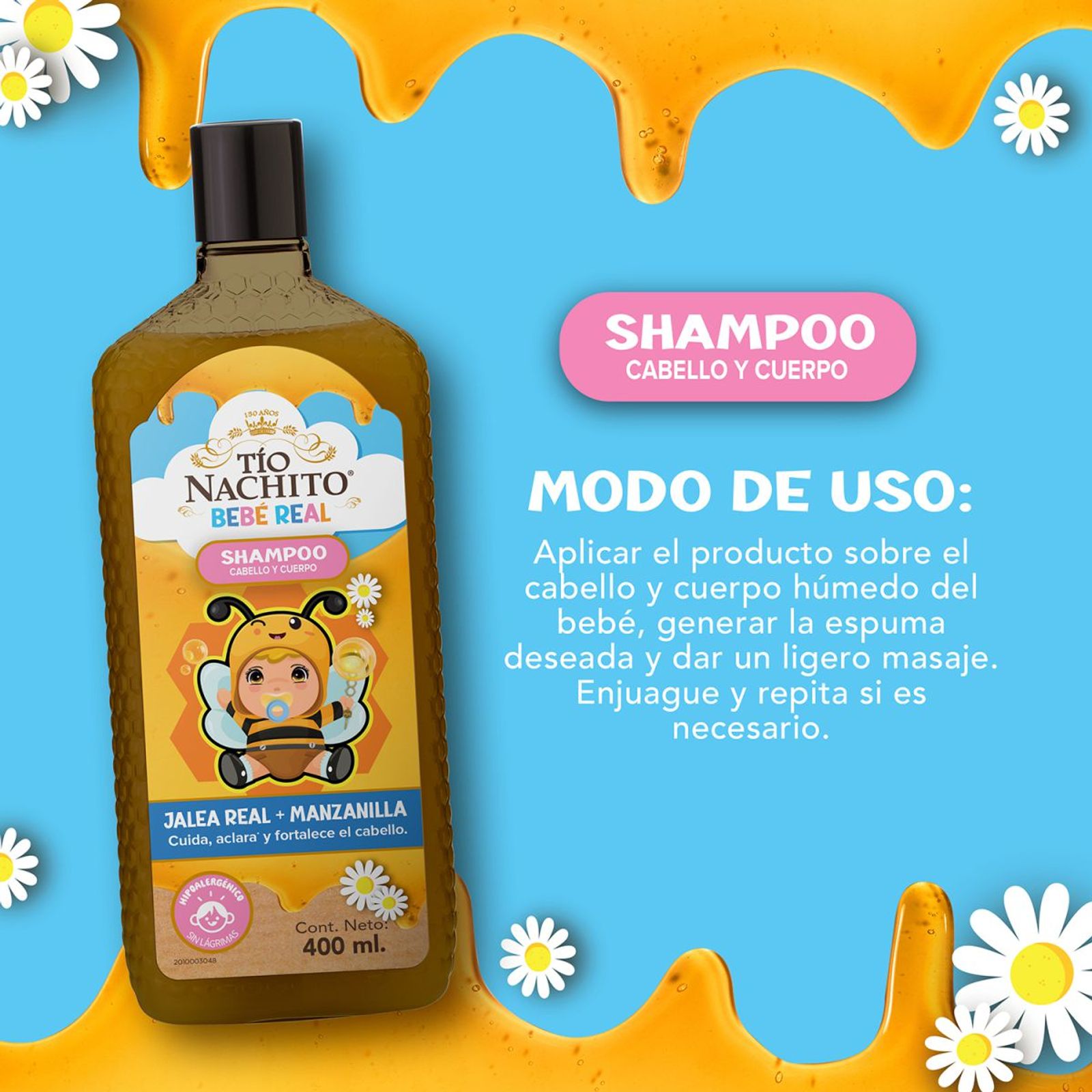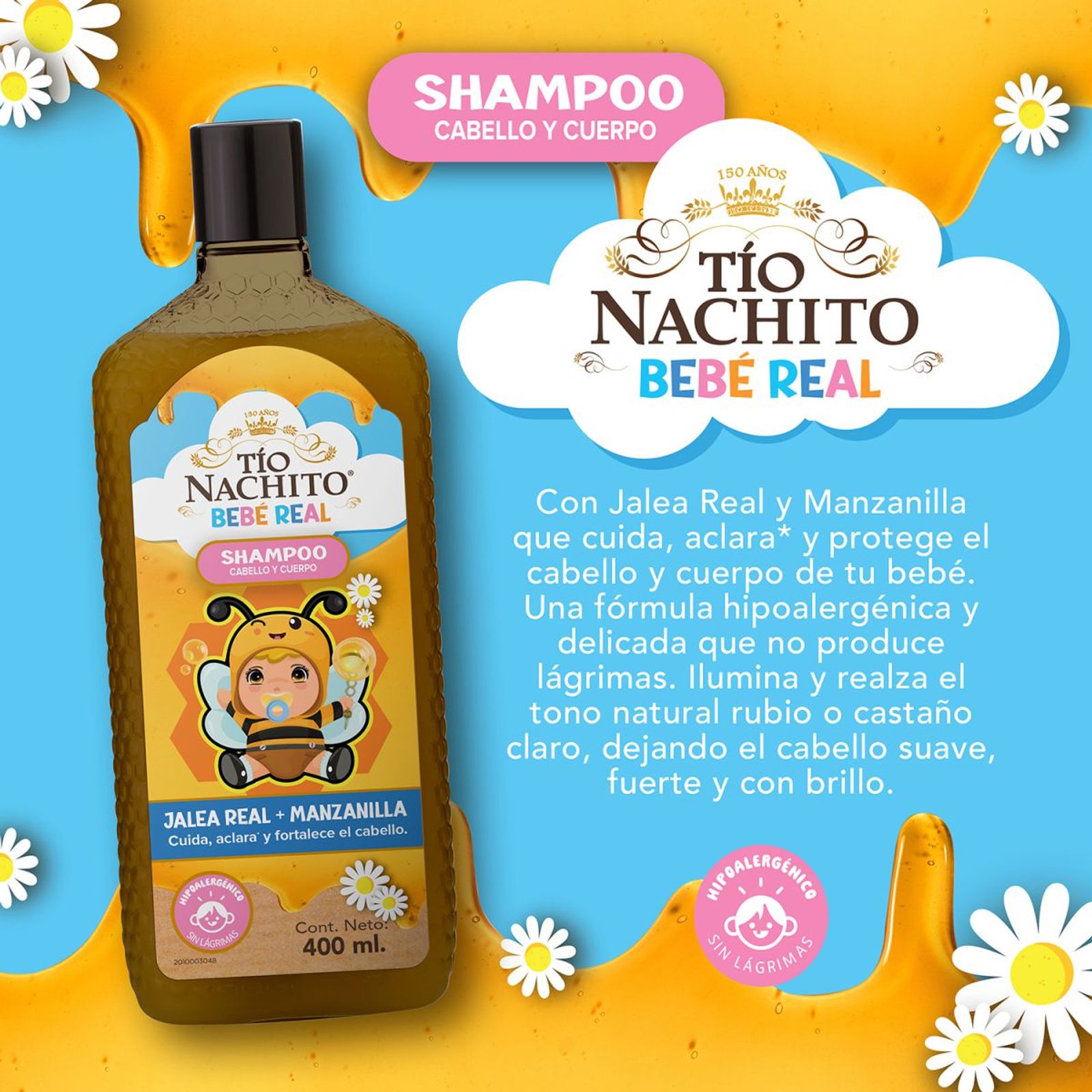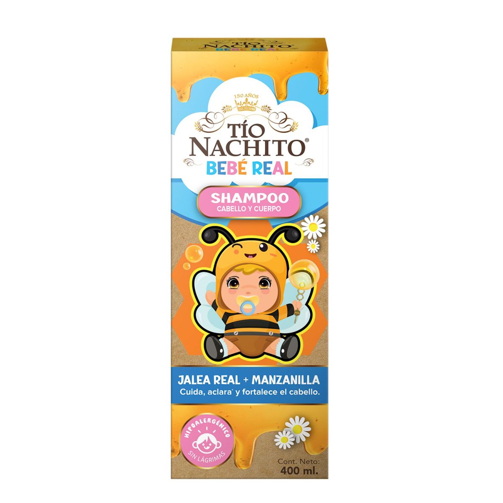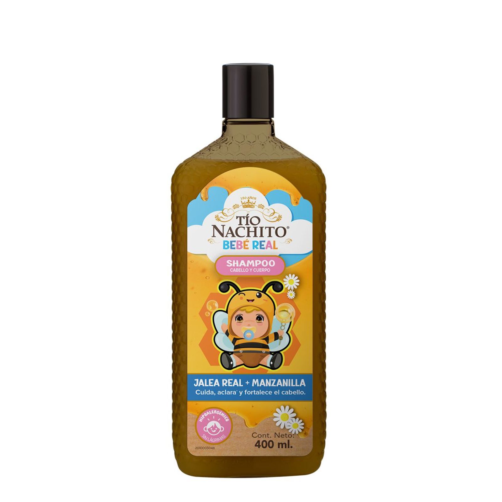Tío Nachito Bebé Real Shampoo 2en1: pelo y cuerpo, 400 ml Tío Nachito Bebé Real, el único shampoo para bebés con 94% ingredientes naturales 2 en 1: pelo y cuerpo. Con Jalea Real y Manzanilla, para proteger, dar suavidad y aclarar el cabello de tu bebé sin producir lágrimas; gracias a su fórmula natural e hipoalergénica. Además, para que el baño sea un momento lúdico, incluye un divertido burbujero. Este shampoo ha sido cuidadosamente formulado para ser seguro y eficaz para los más pequeños. La Jalea Real aporta nutrientes esenciales que fortalecen el pelo y el cuero cabelludo, mientras que la Manzanilla ayuda a calmar y suavizar la piel delicada del bebé. Este producto no solo limpia y cuida, sino que también proporciona una experiencia sensorial agradable, convirtiendo el baño en un momento de juego y diversión. Con Tío Nachito Bebé Real, cada baño se convierte en una oportunidad para nutrir, proteger y disfrutar juntos.