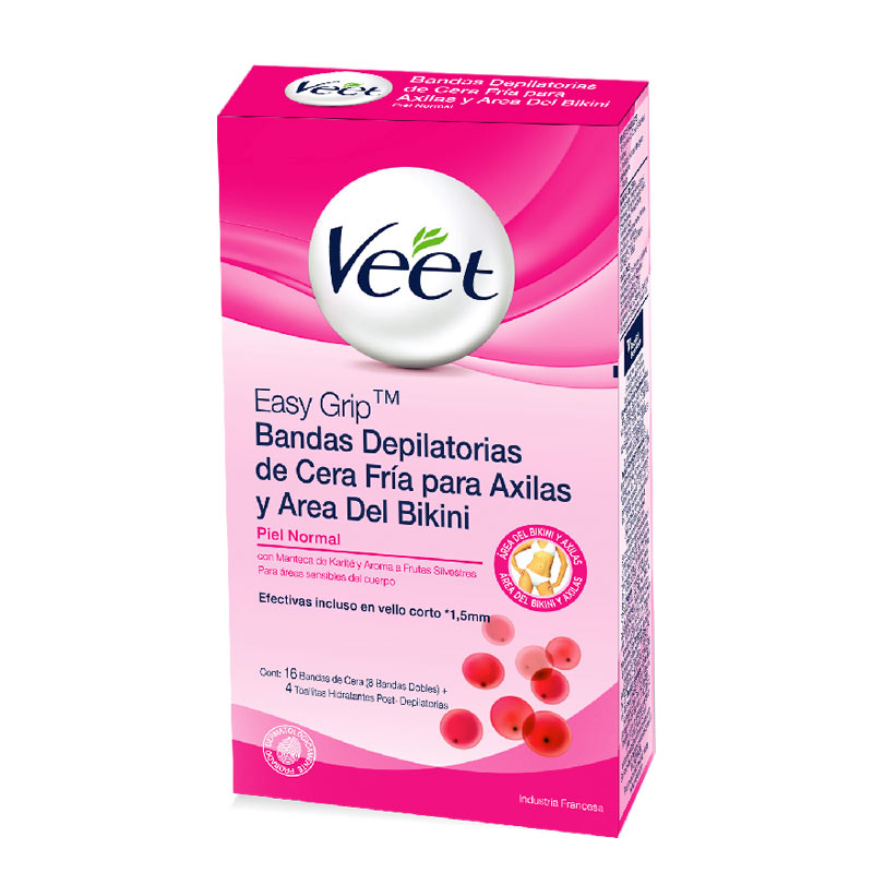 Veet® bandas depilatorias para axila y bikini para piel sensibles eliminan el vello desde la raíz. Su tecnología Easy-Gel™ que captura hasta el vello mas corto de raíz desde 1,5 mm. No hace falta frotarlas! Sus ingredientes naturales con manteca de Karité, dejan la piel suave y humectada hasta por 28 días. Ideales para depilar axila y bikini. Revisa instrucciones antes de usar.