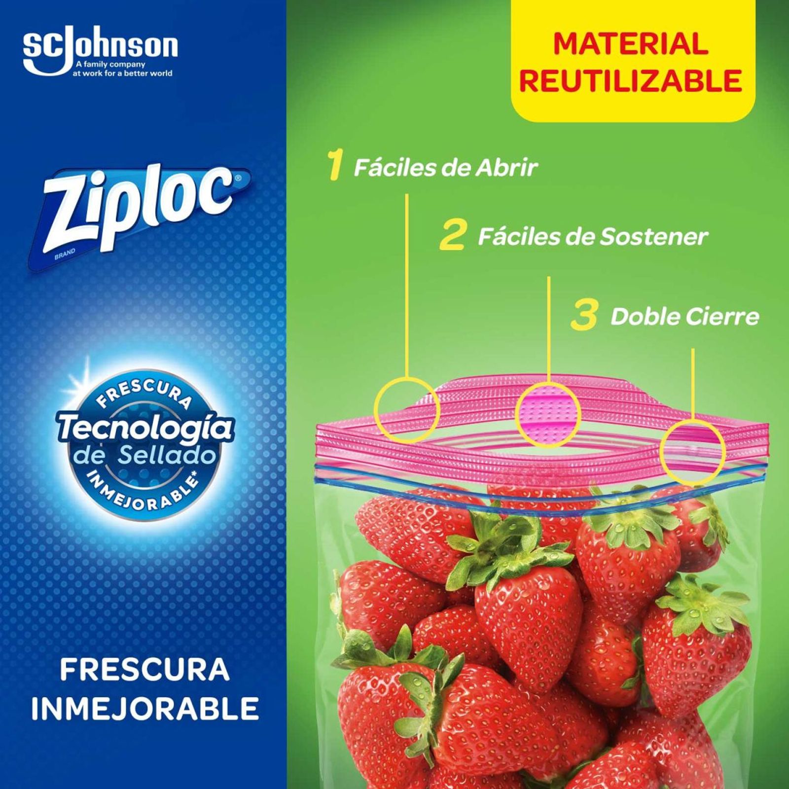 Ventajas: *Las bolsas Ziploc evitan el contacto de tu comida con otros alimentos… *Ayuda a mantener la comida en buen estado por más tiempo. * Nueva tecnología ‘Sellado inteligente’, diseñado para una frescura y accesibilidad inmejorable! * Características: 1) Pestaña abre fácil extendida 2) Doble cierre hermético 3) Textura de fácil agarre, antideslizante para una fácil manipulacion de la bolsa incluso con manos mojadas o grasientas. Perfecto para: *Conservar todo tipo de alimentos en la heladera: Vegetales, frutas, carnes, pescados, quesos o fiambres. *Ideal para guardar lo que necesites: alimentos, cosméticos, etc. Medidas: 26,8 cm x 27,3 cm 10 unidades